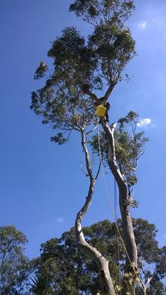 The tree being cut down was in a suburban backyard. We set up the ladder to a tree in the front yard and hammered some nails into a stump about 4m high. Then using utility cord, the makeshift plastic nest was laced and secured - another nail was hammered in and bent to keep it sturdy.